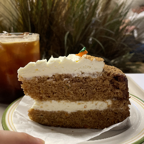 당근모양이 살짝 이상하긴한뎈ㅋㅋㅋㅋㅋㅋㅋㅋㅋ 크림치즈가 두툼하게 발려있고 위에는 시나몬 가루로 달달함을 잡은 당근케이크! 였다. 기대 이상으로 맛있어서 놀랬다. 달달한 크림치즈랑 당근케이크 시트가 아주 잘어울렸고 늦은시간이었지만 시트가 그렇게 뻑뻑하지않았다!! 친구가 디저트를 별로 안먹어서 나혼자 거의 흡입 @.@ 담에 가도 또 먹을것같은 케이크!!